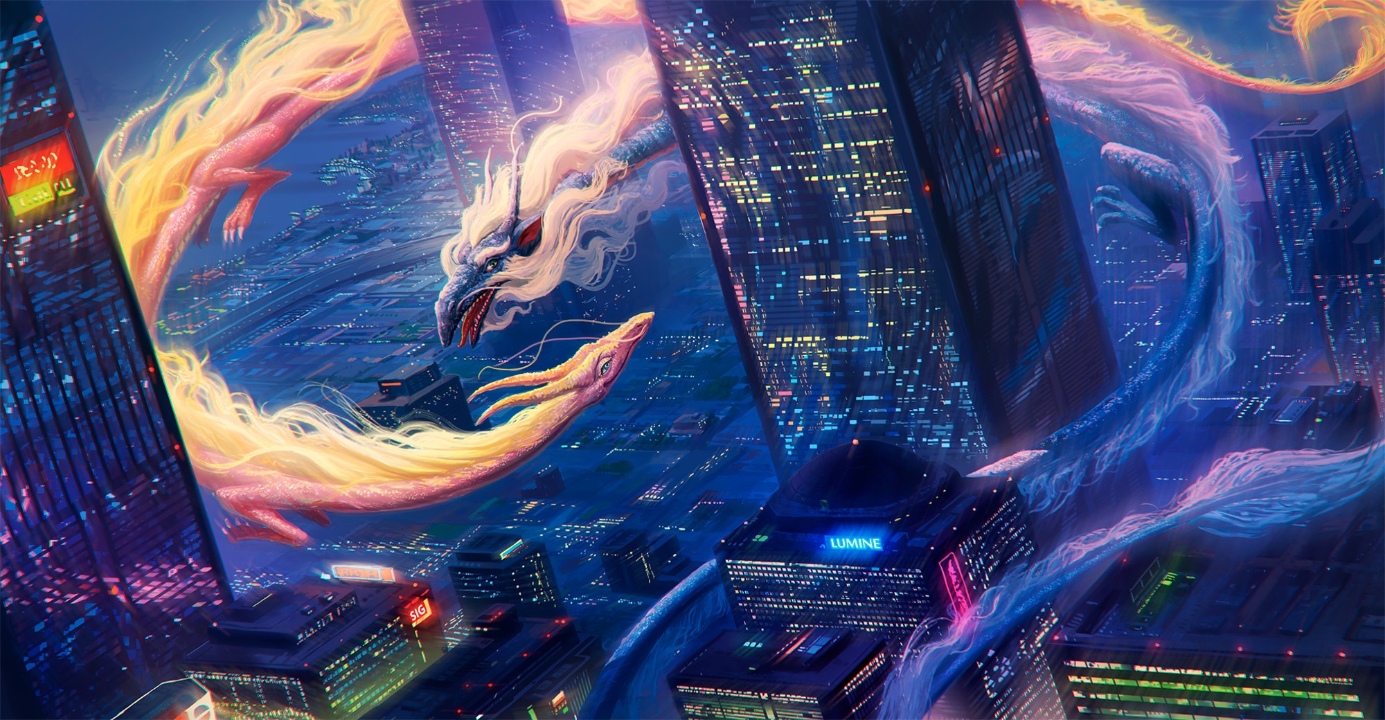 Fire Water Yellow Blue Cityscape Dragon Cityscape